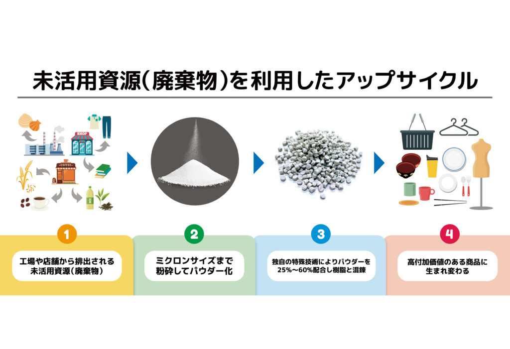 現在、捨てられてしまっているあらゆる未活用資源(コーヒー滓、お茶滓、もみ殻、野菜くず、紙くず等)をニーズに応じ加工し「脱プラ、脱炭素に寄与する環境材料(未活用資源をプラスチックや生分解性樹脂に高濃度で混錬した材料)」として活用する。独自技術で製造する環境材料は、様々な成形方法に対応可能な材料に調整することが可能で、抗菌・脱臭等の付加価値付与も可能。